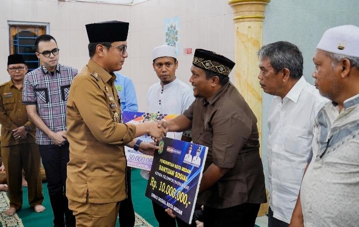 Selain untuk kemakmuran masjid, Pemko Medan melalui perangkat daerah terkait juga menyerahkan bantuan sosial senilai Rp 10 juta rupiah, rak buku lengkap dengan buku bacaan dan satu set tenis meja serta bantuan pangan berupa bibit cabai.