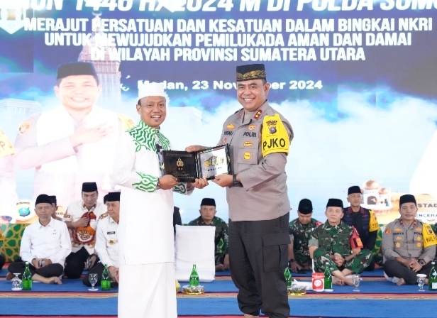 Dalam acara tersebut, Kapolda Sumut turut memberikan penghargaan dan plakat kepada Al-Ustadz Dr. H. Das’ad Latif atas kontribusinya dalam menyampaikan pesan-pesan kebangsaan dan persatuan melalui dakwah.