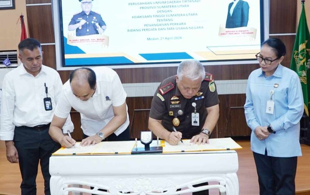 Perusahaan Umum Daerah Tirtanadi Provinsi Sumatera Utara menjalin kerjasama dengan Jaksa Pengacara Negara pada Bidang Perdata dan Tata Usaha Negara Kejaksaan Tinggi Sumatera Utara dengan penantandangan perjanjian kerjasama (PKS) yang berlangsung di Aula Cipta Kerta lantai III Jalan Jenderal besar AH Nasution Medan, Selasa (21/4/2026).