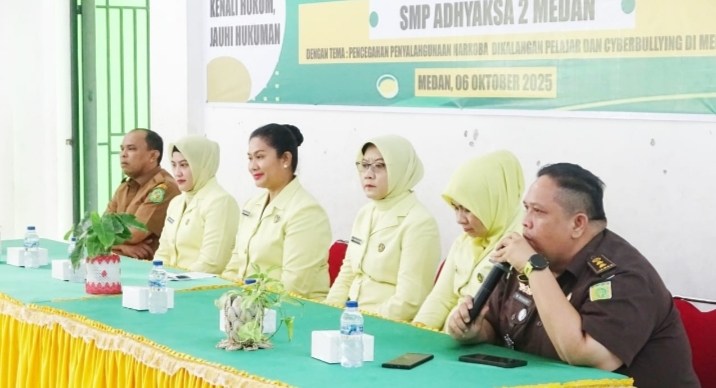 Ketua Ikatan Adhyaksa Dharmakarini (IAD) Wilayah Sumatera Utara Tiurmaida Harli Siregar menyambangi Sekolah Menengah Pertama (SMP) Swasta Adhyaksa 2 Medan yang terletak di Jalan HM Said No 23 Medan Timur kota Medan, Senin (6/10/2025).