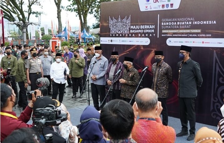 Di Pelataran Jam Gadang, Bukittinggi, Wapres meresmikan Gernas BBI yang dimulai dengan kata sambutan Selamat Datang Gubernur Sumbar, diikuti dengan Laporan Ketua Dewan Komisioner Otoritas Jasa Keuangan (OJK) Wimboh Santoso, dan Penyerahan KUR dan Bantuan Sertifikasi Halal.