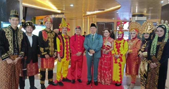 Terlihat wajah bahagia dari para penerima tamu berpakaian adat Sumatera saat salah satu anggota Dewan Perwakilan Rakyat Daerah (DPRD) Drs Wong Chun Sen Tarigan MPd B datang menghampiri dan mengajak berfoto bersama.